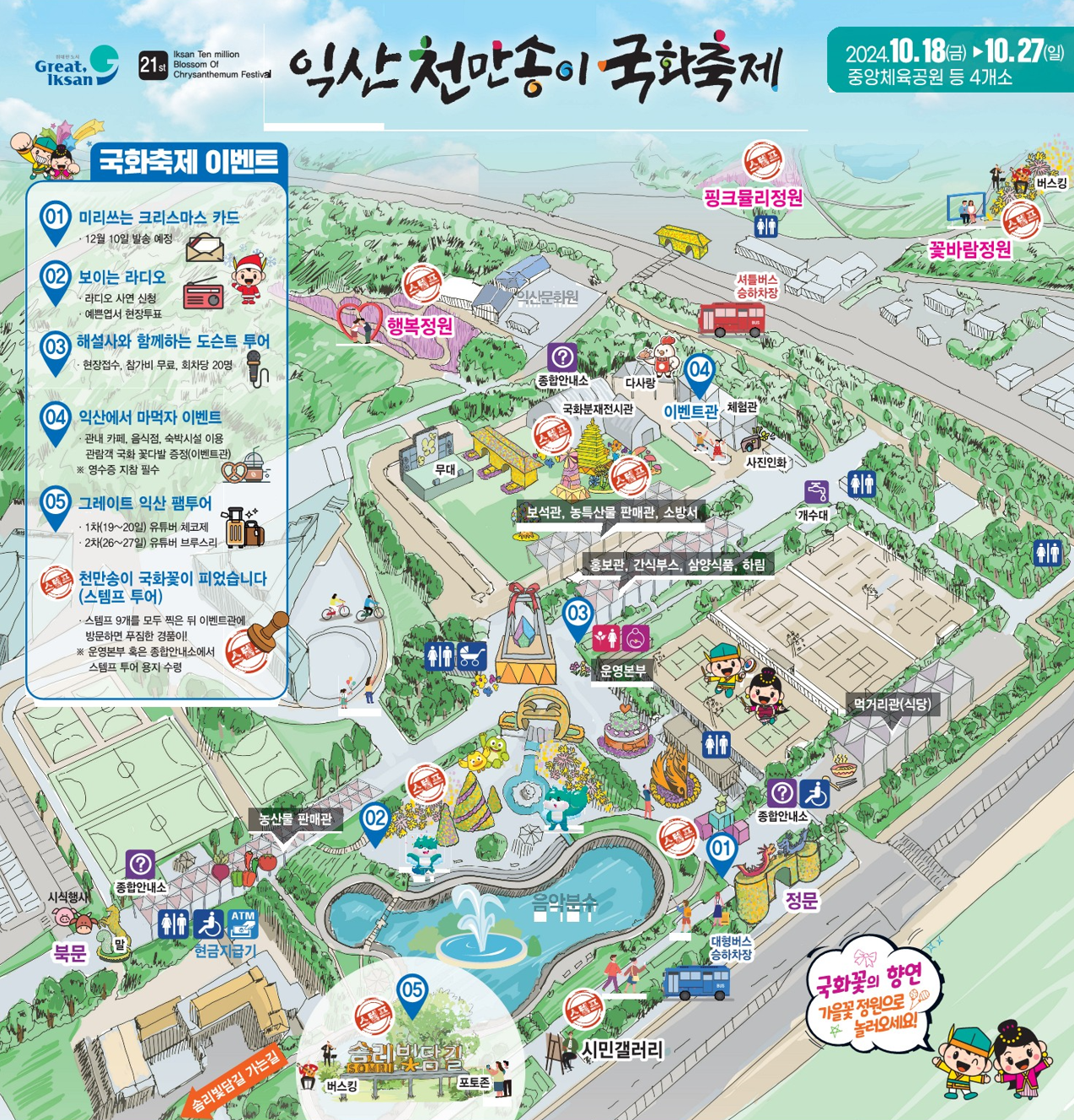 올해 축제는 ‘천만송이 국화로 정원을 꽃피우다’를 주제로 삼았다. 전시공간은 중앙체육공원을 비롯, 인근의 신흥공원 꽃바람정원과 솜리빛담길까지 확대됐다. 미륵사지와 익산역, 신흥근린공원에 분산된 꽃 전시는 축제가 끝난 이후인 11월 3일까지 늦가을을 장식할 예정이다.